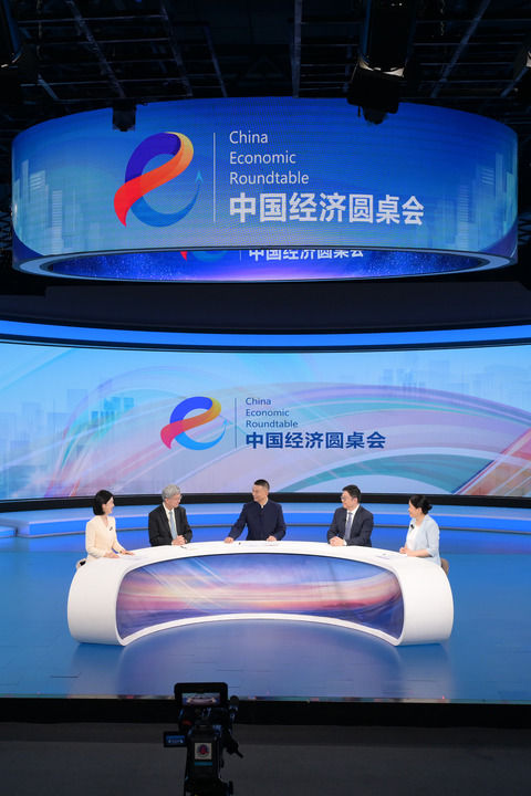 嘉宾们在第十五期“中国经济圆桌会”大型全媒体访谈节目录制现场交流发言。新华社记者李贺摄