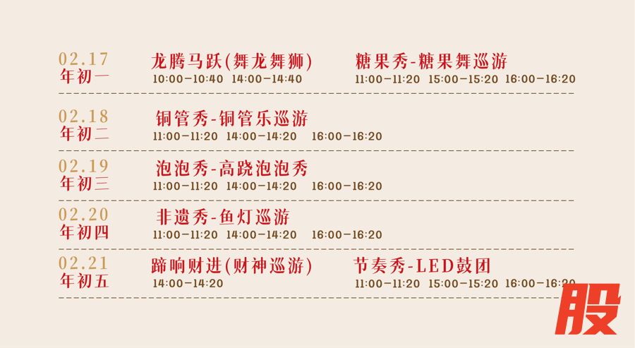 《马祝欢腾》新春主题巡演(2.17-2.21初一至初五):每日精彩不重样,点燃节日氛围——初一龙腾马跃舞龙舞狮与糖果舞巡游,初二铜管乐巡游,初三高跷泡泡秀,初四非遗鱼灯巡游,初五财神巡游与LED鼓团表演,多时段演出承包全天候欢乐。